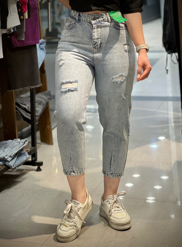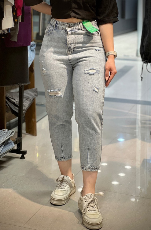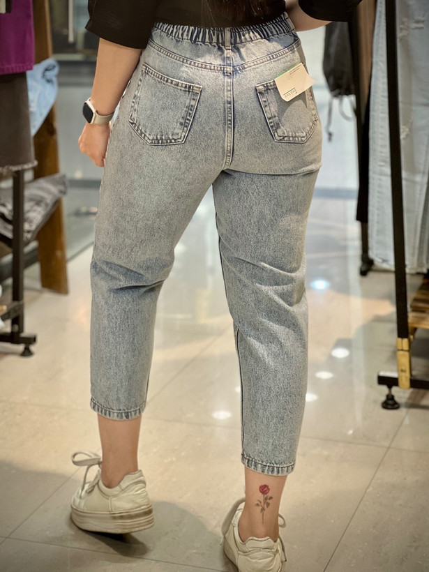 شلوار جین مام فیت پشت کش زاپ دار آبی روشن زنانه